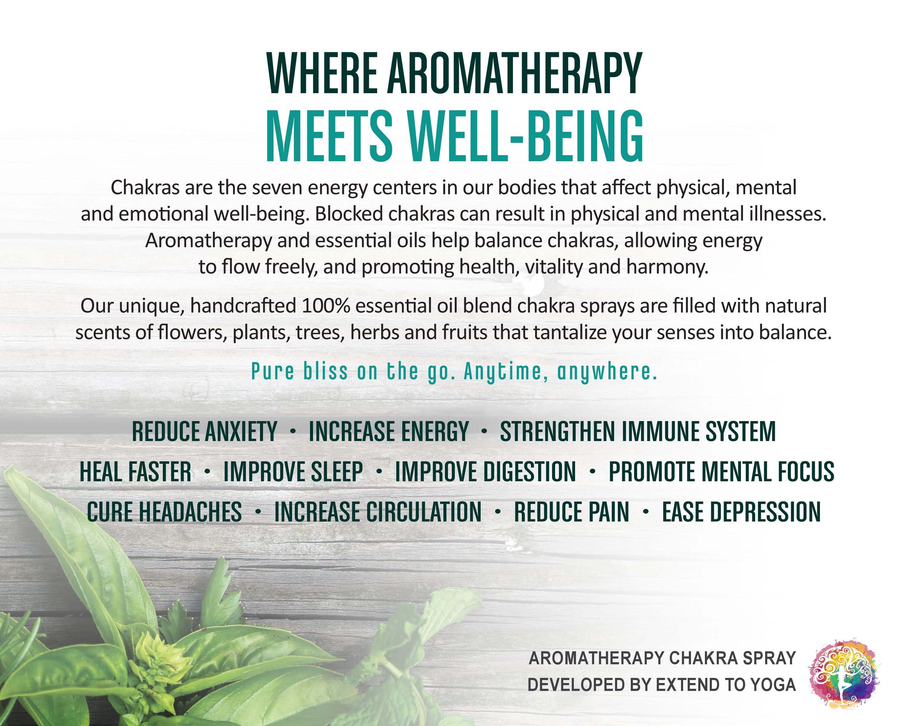 The Extend to Yoga 100% Essential Oil Chakra Spray line features seven sprays, each filled with the natural scents of flowers, plants, trees, herbs and fruits that tantalize your senses into balance. Our ingredients include white fir, juniper, lavender, lemongrass, spearmint, cedarwood, basil,